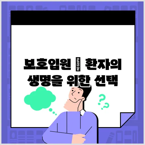 보호입원은 정신적 혹은 신체적으로 위협을 받을 수 있는 환자를 안전하게 보호하기 위해 법적으로 입원시키는 제도입니다. 이는 환자의 생명과 안전을 최우선으로 고려하며, 일반적으로 긴급한 상황에서 시행됩니다.